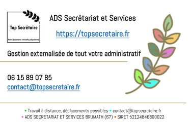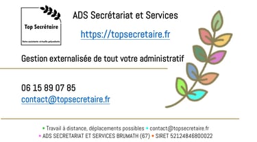 Top Secrétaire : Ce site appartient à l'entreprise individuelle ADS SECRETARIAT ET SERVICES située à 67170 BRUMATH - +33615890785 - info@topsecretaire.fr